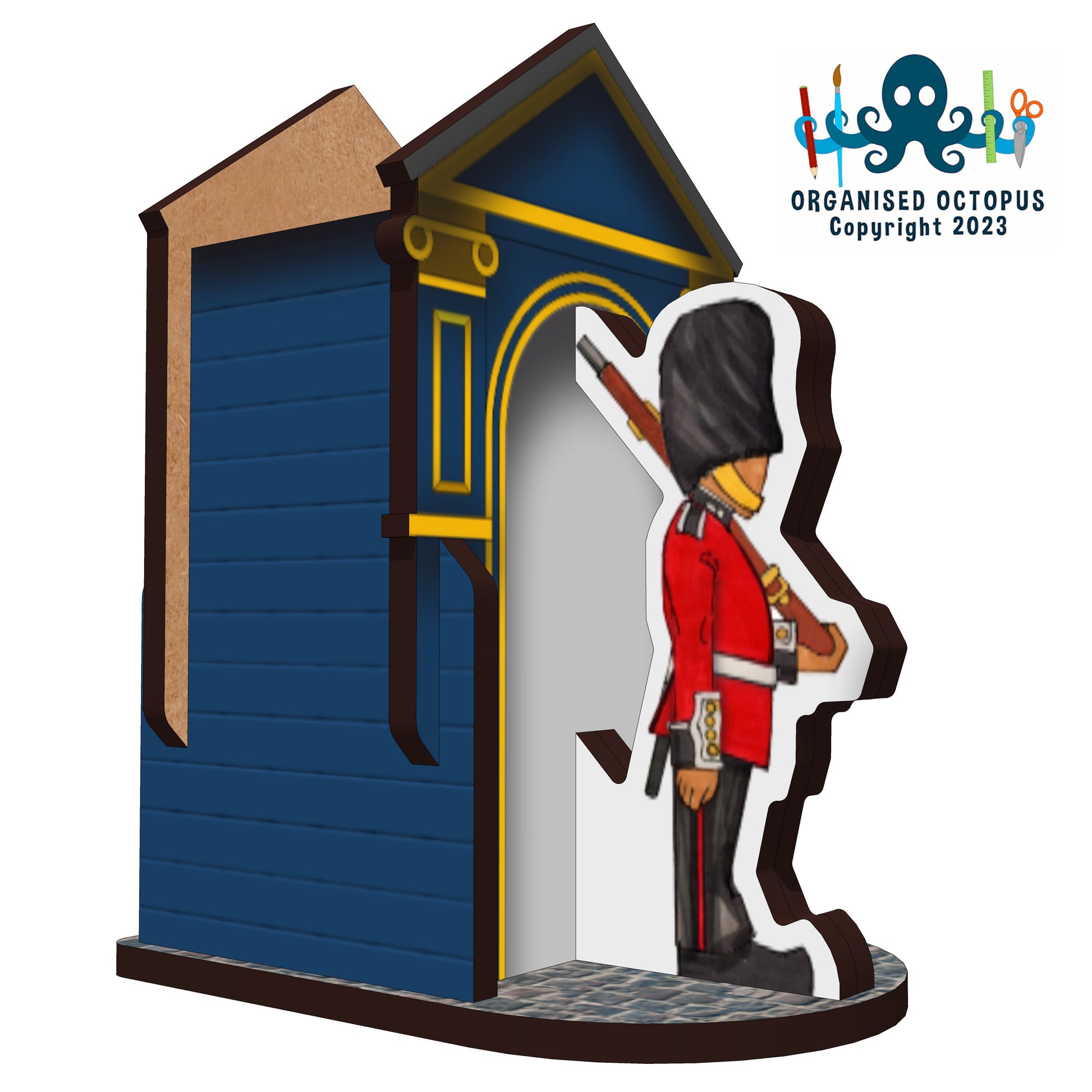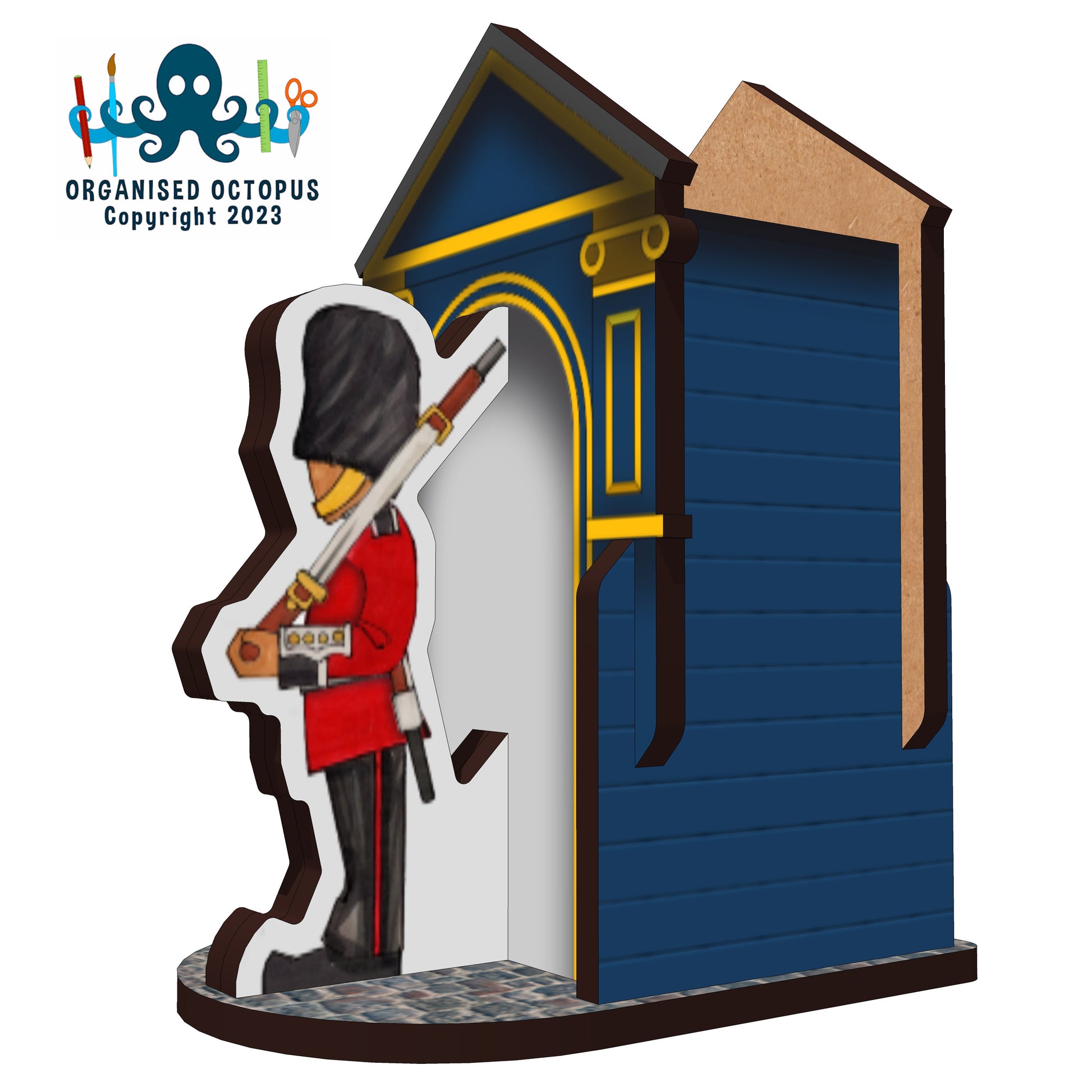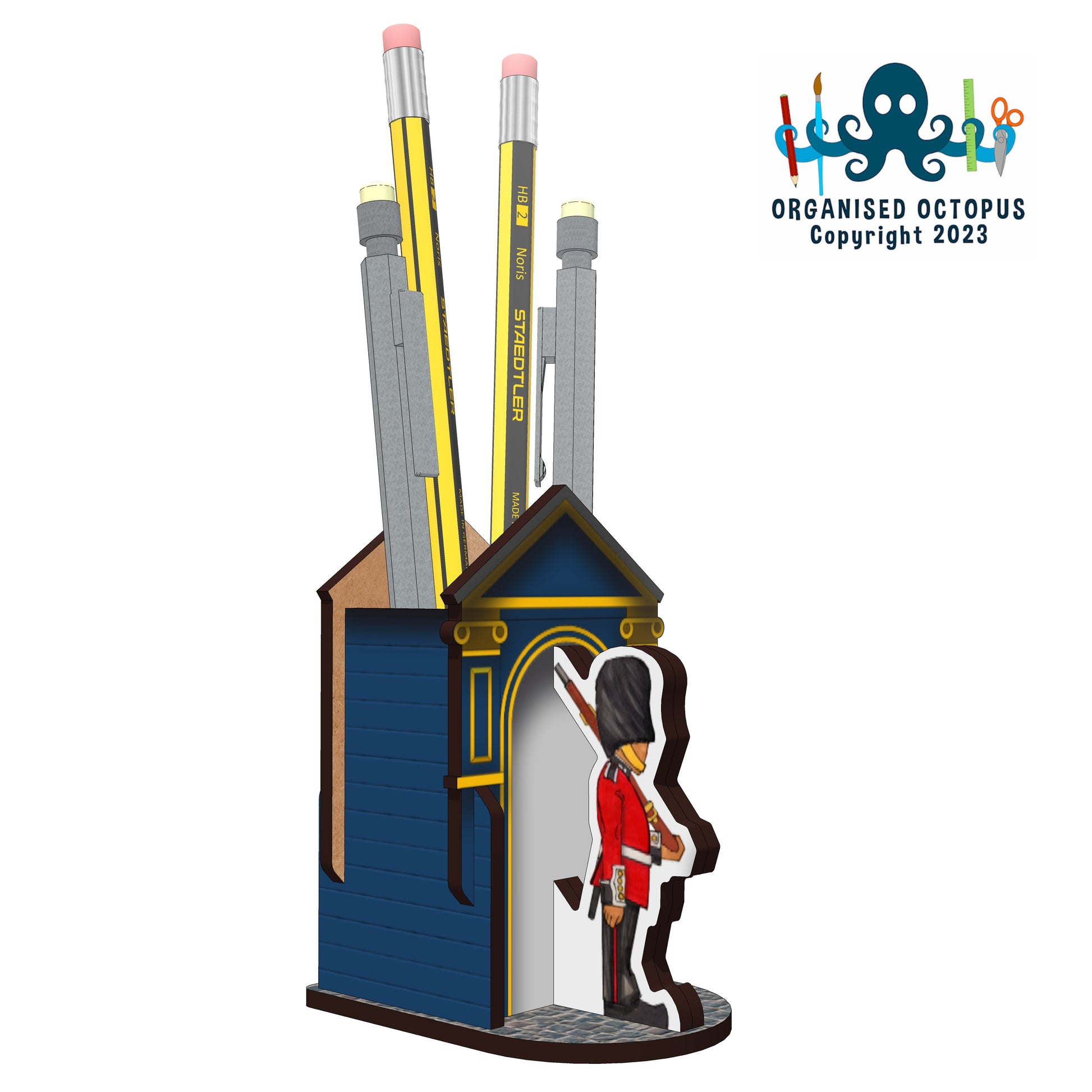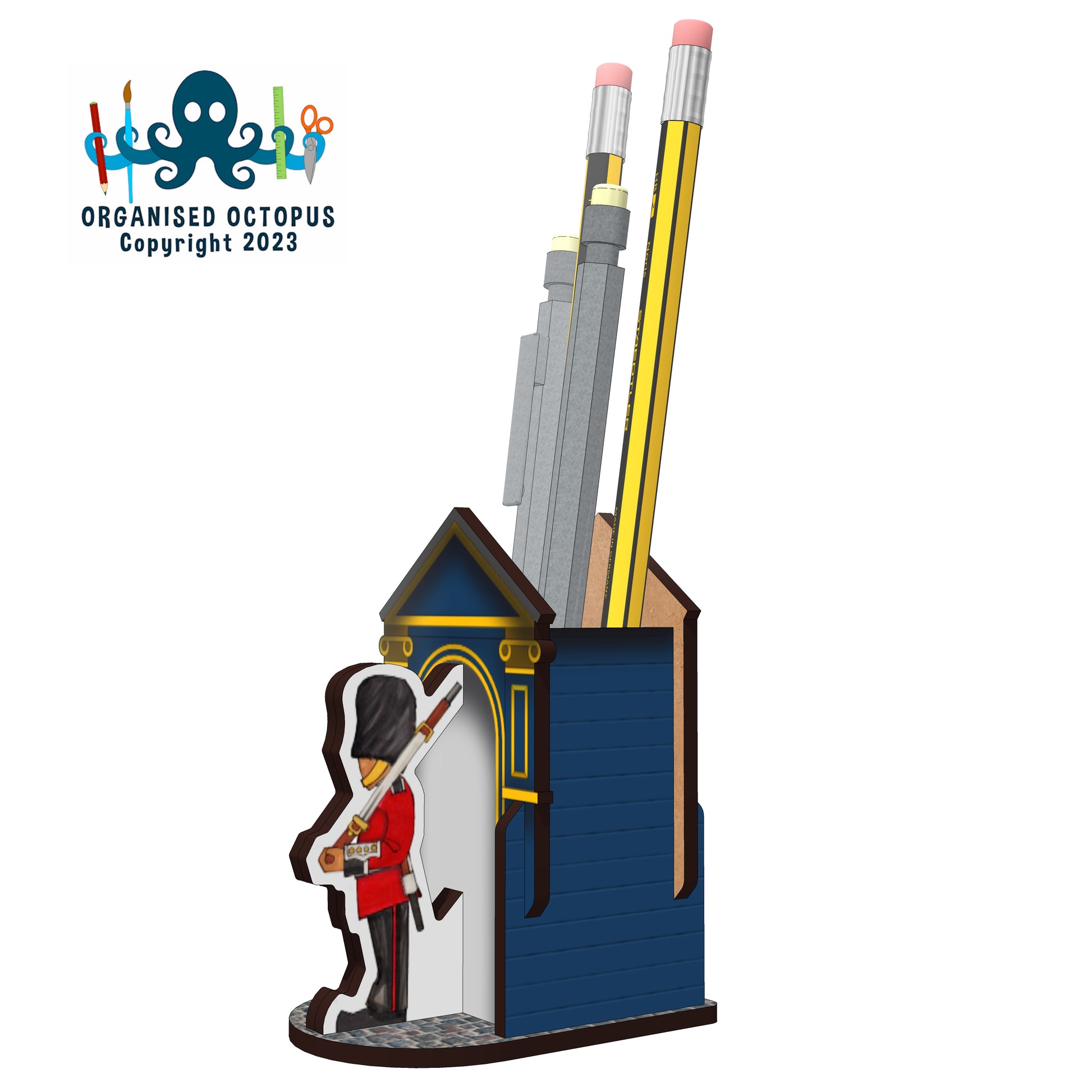 A4 Flatpack Self Assembly Kit. Made from 3mm Laser cut MDF (FSC Sourced) and UV printed. May require glue (PVA white Glue or Superglue). This is NOT A TOY, not suitable for children under 5yrs,may contain small parts. Care should be taken when removing parts and assembling. Assembled Dimensions D7.5 W5 H9cm (pen space D4cm W3cm H9cm)